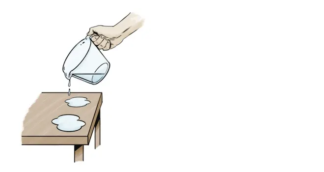 - Pour the water onto the table in four different sections. Each section should contain exactly ¼ of a cup of water. (Make sure to give yourself some room, sothe pools of water don’t overlap.)